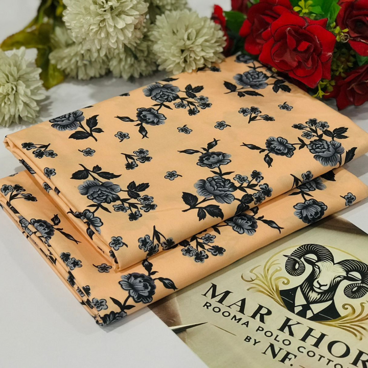 Yeh Mar Khorr ka Rooma Polo cotton fabric peach base color ke sath black floral print design mein available hai. Yeh fabric bohat hi naram, breathable, aur comfortable hai, jo rozana pehnne ke liye perfect hai. Iska design subtle aur elegant hai, jo aapke kapdon ko ek classy aur timeless look deta hai. Yeh fabric durable bhi hai, jis se aap lambe arse tak apne kapdon ki quality aur comfort ka lutf utha sakte hain.